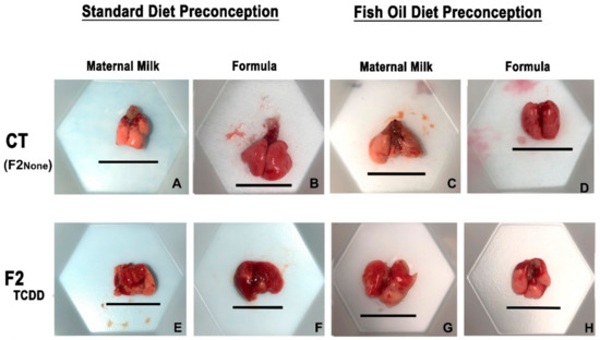 Evidence from the literature suggests that hemorrhaging and edema are both associated with inflammation in BPD and other pulmonary diseases [11,32] and further compromises lung capacity [11,33]. We report here that independent of neonatal diet, F2TCDD pups exhibited both lung hemorrhaging and edema denoted by gross anatomy and an increased ratio of wet-to-dry lung weight (Figure 1 and Figure 2). Our findings in mice born to toxicant-exposed fathers mirror the data of studies examining human infants with new BPD [34,35].