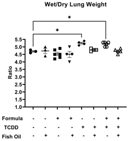 Next, we measured lung edema in all groups by assessing the mean wet-to-dry lung weight ratio. Among all groups, there were no significant differences when considering wet lung weight or dry lung weight individually (Supplemental Figures S1 and S2). F2None pups, independent of paternal and neonatal diet, did not exhibit lung edema as characterized by a wet-to-dry lung weight ratio of 5 or greater. However, F2TCDD (p = 0.0168) and F2TCDD/Form (p = 0.0246) pups displayed a significant increase in wet-to-dry lung weight compared to F2None pups. Additionally, 100% (4/4) of F2TCDD pups exhibited a wet-to-dry lung weight ratio of 5 or greater. Interestingly, 60% (3/5) of F2TCDD/Form pups exhibited a wet-to-dry lung weight ratio of 5 or greater. None of the F2TCDD/Fish (N = 4) and F2TCDD/Fish/Form pups (N = 5) exhibited a wet-to-dry lung weight ratio of 5 or greater (Figure 2).