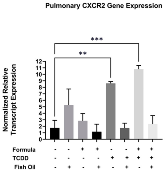 Cxcr2, a CXC chemokine receptor, is commonly overexpressed in pulmonary diseases such as acute lung disease, chronic obstructive pulmonary disease, and new BPD [21,22,23]. Additionally, TCDD exposure can elicit immune responses in a Cxcr2-dependent manner [24]. Herein, we evaluated whether a paternal history of TCDD exposure was associated with increased pulmonary expression of Cxcr2 in neonatal offspring. We additionally assessed the impact of both the paternal diet (standard or fish oil) and neonatal diet (with or without formula supplementation) on this outcome. We measured the mRNA transcript level of Cxcr2 in the lungs of all F2 neonates. Our studies revealed that F2TCDD (p = 0.0007) and F2TCDD/Form pups (p = 0.0077) exhibited significant increases in the normalized relative transcript expression of Cxcr2 when compared to F2None pups. Intervening with a paternal fish oil diet preconception normalized the relative transcript expression of Cxcr2 in F2TCDD/Fish and F2TCDD/Fish/Form pups to F2None pups (Figure 3). It is interesting to note that formula, in the absence of paternal TCDD exposure, had little impact on pulmonary Cxcr2 gene expression. In contrast, expression of this gene was highest in F2TCDD/Form pups suggesting a potential synergistic effect of paternal exposure and neonatal diet.