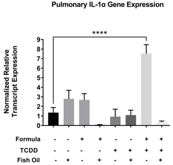 Activation of the Il-1 family of cytokines is downstream of Cxcr2 activation and aberrant expression of the Il-1 family has been implicated in pulmonary diseases such as new BPD [25,26]. Therefore, we assessed the relative mRNA transcript expression of Il-1 alpha in F2None and F2TCDD groups. We found that Il-1 alpha expression in lungs of F2 pups was not impacted by formula alone (F2None/Form) or paternal toxicant exposure alone (F2TCDD). In contrast, Il-1 alpha expression was significantly increased in F2TCDD/Form pups (p < 0.0001), strongly suggesting a synergistic effect of these treatments. Intervening with a paternal fish oil diet preconception reduced the relative expression level of Il-1 alpha among F2TCDD/Fish/Form pups when compared to F2TCDD/Form pups (Figure 4).