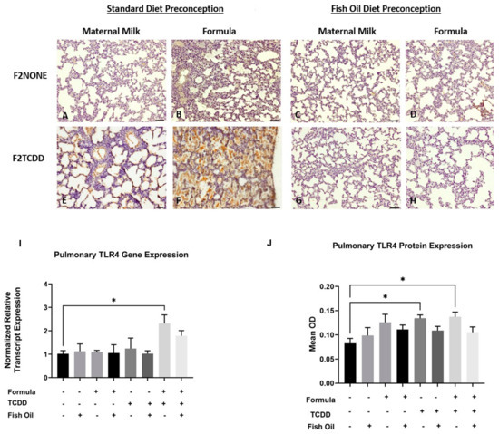 A paternal fish oil diet normalized pulmonary Tlr4 gene and protein expression in F2TCDD pups. Representative images from multiple lungs (N = 3 or more /group) of Tlr4-stained perfused lung tissue on postnatal day 11. Original magnification 200× (A–H); F2NONE (A), F2NONE/Form (B), F2NONE/Fish (C), F2NONE/Fish/Form (D), F2TCDD (E), F2TCDD/Form (F), F2TCDD/Fish (G), F2TCDD/Fish/Form (H). Lung RNA was isolated from all groups and subjected to qRT-PCR for Tlr4 (I). TLR4 protein expression was determined by computer-assisted quantification of DAB substrate from lung immunohistochemistry experiments (J). For this set of experiments, each exposure and treatment group consisted of 3 pups from multiple litters (* p < 0.05).