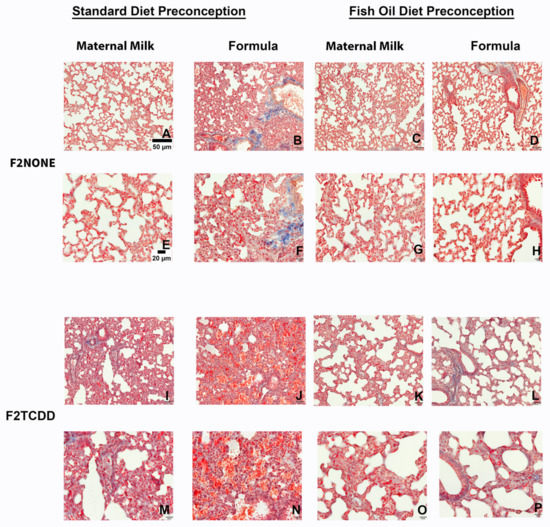 Finally, we performed Masson’s Trichrome staining to assess the incidence of pulmonary fibrosis in all F2 groups (Figure 6). Although it is normal for collagen to be deposited around pulmonary vessels [29], collagen deposition surrounding alveoli (identified by the overlap of blue and red staining) is not normal and indicates fibrosis. We found that F2NONE pups displayed little-to-no signs of pulmonary fibrosis (Figure 6A,E), but collagen deposition was commonly observed in control pups receiving supplemental formula (F2NONE/Form pups) (Figure 6B,F). However, pulmonary fibrosis was reduced in formula-fed control pups whose fathers were provided fish oil (F2None/Fish/Form pups) (Figure 6D,H). F2TCDD and F2TCDD/Form pups also demonstrated signs of pulmonary fibrosis (Figure 6I,M). However, only F2TCDD/Form pups exhibited interalveolar red blood cell infiltration (Figure 6J,N), consistent with our previous observations [9]. F2TCDD/Fish pups displayed a reduction in fibrosis and improvement in alveolarization (Figure 6K,O). Although F2TCDD/Fish/Form pups also exhibited improved alveolarization and their risk of interalveolar red blood cell infiltration was eliminated, pulmonary fibrosis was still apparent in approximately 50% of these pups (Figure 6L,P).