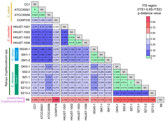 Uncorrected nucleotide genetic distances (p-distances) of the ITS region between Crypthecodiniaceae and other dinoflagellates. Values lower than 0.04, which was suggested as the species-level divergences cut-off, are highlighted in green color [42].