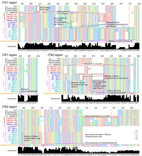 ITS regions exhibited intra-specific truncations-insertions within the Crypthecodiniaceae. This schematic diagram shows the location of extra and missing nucleotide stretches observed in the ITS1 and ITS2 regions in C. cohnii, C. croucheri and Ryukyu Crypthecodinium spp. See Figure S1 for the full set of ITS1-5.8S-ITS2 sequence alignments.