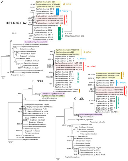 We constructed phylogenetic trees with selected taxons that have either one of the three rDNA markers. In phylogenetic analysis, it is apparent that the Crypthecodinium taxons contain well defined clades with inter- and intra-species level variations. All three C. croucheri ribotypes form a clade (Figure 3A–C) with phylogenetic positions closer to selected Rykuyu Crypthecodinium sp. ribotypes than C. cohnii.