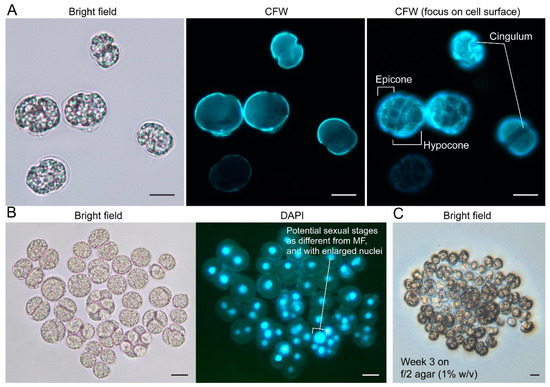 Crypthecodinium croucheri. sp. nov.: (A) fluorescence photomicrographs of calcolfuor white (CFW)-stained cells; (B) Light and fluorescent (DAPI) photomicrographs showing examples of multiple fissions, also served to show lack of bacterial contamination and (C) formed colonies on 1% (w/v) f/2-agar plate. Scale bar = 10 µm.