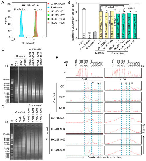Comparative genome sizes and AFLP patterns of Crypthecodiniaceae strains: (A) Flow cytogram overlays of propidium iodide (PI)-stained Crypthecodinium cohnii CC1, C. croucheri sp. nov (HKUST-1001, 1002, 1003, 1006), and Breviolum minutum. Only G1 DNA-peak (haploid) was shown. (B) By including samples with known genome size (HL-60—6.51 pg cell−1 [48], B. minutum—1.5 pg cell−1 [49], Saccharomyces cerevisiae—0.017 pg cell−1 [50]) (R2=0.9983), the relative (mode) PI fluorescence was used to calculate the genome size of the C. croucheri and C. cohnii samples. Asterisks (*) indicate significant difference from C. cohnii CC1 (unpaired t-test, p < 0.05). n.s. = no statistical difference. AFLP fingerprint patterns of Crypthecodiniaceae strains were generated using (C) Cc18 and (D) Cc20 primer pairs. M = 1 kb plus DNA ladder (Invitrogen). (E) Densitometric profile of the AFLP-generated DNA bands as shown in (C) and (D). Small Roman “i–v” and “vi–ix” correspond to Cc18 primers-and Cc20 primers-amplified DNA bands specific to C. cohnii, respectively. Densitometric analysis was performed using tools native to Image Lab software (Bio-Rad, version 6.1).