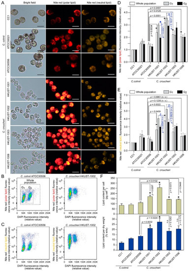 Lipid content of Crypthecodinium cells: (A) Light and fluorescence photomicrographs of Nile-red-stained cells. Nile-red-stained cells were imaged at the corresponding emission spectrum for polar lipids (red fluorescence) and apolar (neutral) lipids (golden yellow fluorescence). Scale bar = 10 µm. (B,C) Flow cytograms of C. cohnii ATCC30556 and C. croucheri HKUST-1002 cells co-stained with DAPI (for relative DNA content) and Nile red for (B) polar and (C) neutral lipid content. Flow cytometric analysis of Nile-red-stained C. croucheri cells suggested higher (D) polar lipid and (E) neutral lipid content per cell (either G1 or G2 cells), when compared to C. cohnii. The symbol “∆” marked the widened differences between G1 and G2 cells’ lipid content in C. croucheri HKUST-1001 and HKUST-1002, which were not observed in C. cohnii. As Crypthecodinium cellular oil content could differ vastly in different genome cycle phases, it is important to compare cell cycle gated values. (F) Total lipid content (per cell and per dry weight) of Crypthecodinium cells were independently quantified by using the sulpho-phospho-vanillin method, as described previously [62,63,64]. All cells were batch-grown at 24 °C in 1:1 (v/v) f/2:rich medium for 7 days without light. Data represent means ± SE of three replicate experiments. Asterisks (*) indicates significantly different from the C. cohnii ATCC30556 (p < 0.05). n.s. = non-significant (p > 0.05).
