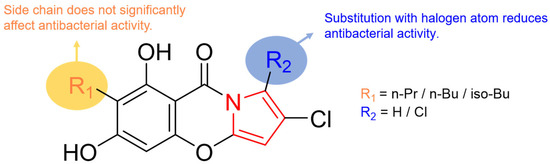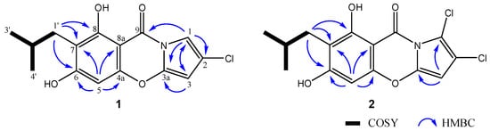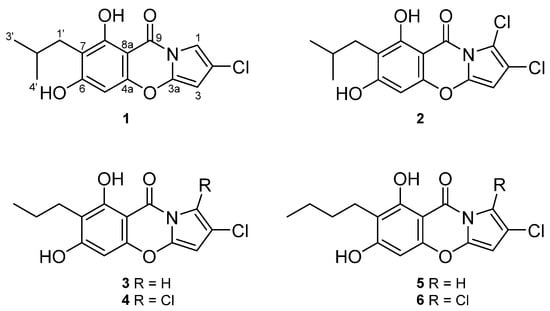The structures of the known compounds (3–6) were determined as 2-chloro-6,8-dihydroxy-7-propyl-9H-pyrrolo [2,1-b] [1,3] benzoxazine-9-one (3), 1,2-dichloro-6,8-dihydroxy-7-propyl-9H-pyrrolo [2,1-b] [1,3] benzoxazine-9-one (4), 7-butyl-2-chloro-6,8-dihydroxy-9H-pyrrolo [2,1-b] [1,3] benzoxazine-9-one (5), and 7-butyl-1,2-dichloro-6,8-dihydroxy-9H-pyrrolo [2,1-b] [1,3] benzoxazine-9-one (6) by comparison of their spectroscopic data with those reported in the literature [23,25].