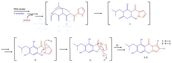 In a previous study, it was reported that streptopyrrole and armeniaspirol had similar biosynthetic relationships, and their biosynthetic pathways were proposed [26,27,28]. Based on the previous reports, we present a plausible biosynthetic pathway for 1 and 2 (Scheme 1).