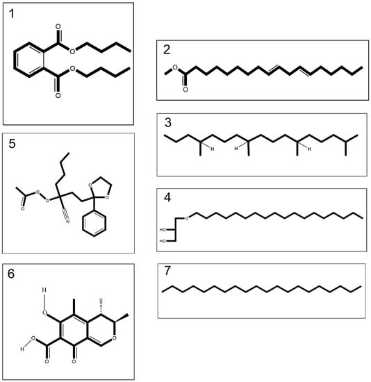 Compounds 1–4 merely tentatively identified from the venom of Cassiopea andromeda and Catostylus mosaicus, compound 5 merely tentatively identified from the venom of C. andromeda and compounds 6 and 7 merely tentatively identified from the venom of C. mosaicus, including dibutyl phthalate (1), 9,12-octadecadienoic acid, methyl ester (2), heptadecane,2,6,10,14-tetramethyl- (3), batilol (4), ethaneperoxoic acid, 1-cyano-1-[2-(2-phenyl-1,3-dioxolan-2-yl)ethyl]pentyl ester (5), citrinin (6) and eicosane (7).