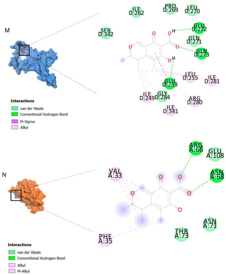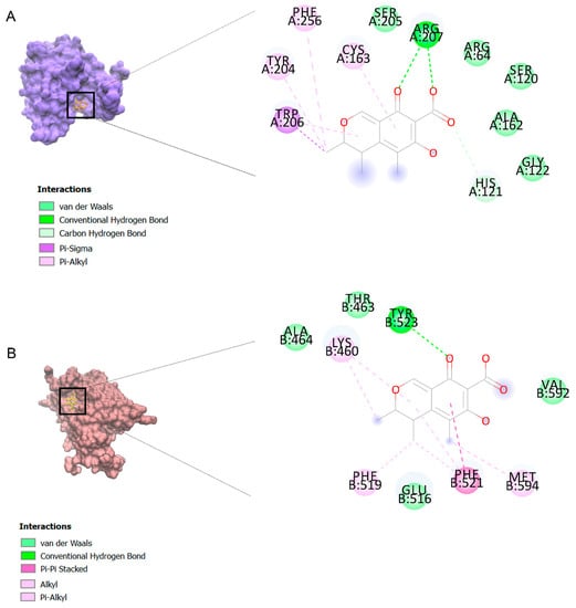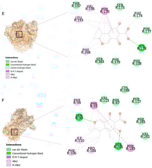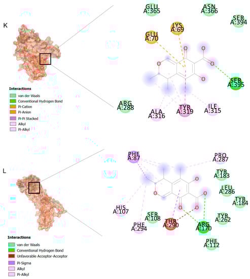 A complex with lower binding affinity (kcal/mol) is more stable, so a ligand–protein conformation with the lowest biding affinity is favorable. The binding affinity values lower than −4 were assigned to good interactive relationships between ligand and target. In this regard, nearly all identified compounds showed good affinity to the targets. However, citrinin and ethaneperoxoic acid, 1-cyano-1-[2-(2-phenyl-1,3-dioxolan-2-yl)ethyl]pentyl ester showed better affinity to targets. It can be attributed to their structure and their intermolecular interactions with targets, including van der Waals interactions, hydrophobic interactions and hydrogen bonds. In better words, among all ligands investigated by means of molecular docking, two ligands (citrinin and ethaneperoxoic acid, 1-cyano-1-[2-(2-phenyl-1,3-dioxolan-2-yl)ethyl]pentyl ester showed better affinity to targets) showed the highest affinity to target receptors.