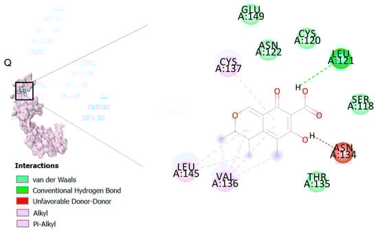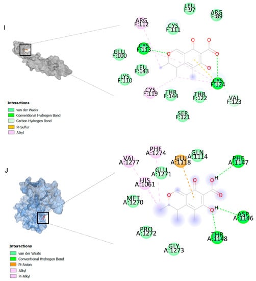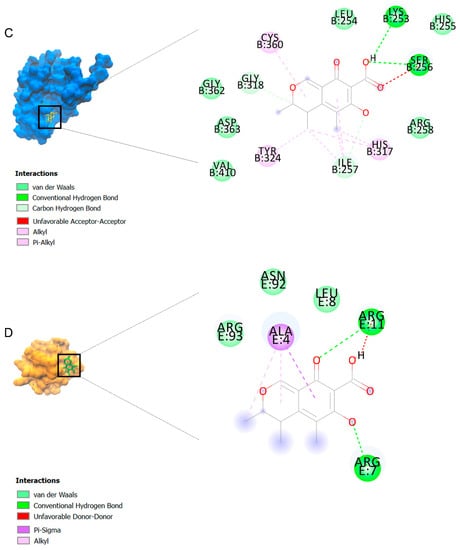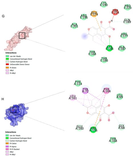 As displayed in Figure 2, the binding of ligands to receptors is under the control of several intermolecular interactions like van der Waals interactions, hydrophobic interactions and hydrogen bonds. Among all of these ligands, citrinin, which is a class of mycotoxins found in diverse natural sources like fruit, grains, and biological fluids with a wide range of biological effects including nephrotoxic, hepatotoxic, immunosuppression and anticancer effects []. As we noted in Table 2, citrinin showed the best affinity to 13 death receptors in A549 cell lines, including caspase-3 and caspase-9. However, its affinity for binding to prostaglandin D2 (PGD2) is more than other targets. Interestingly, stimulation of PGD2 results in an increase in the rate of apoptosis in lung cancer cells due to activation of the caspases pathway and synthesis of ROS (reactive oxygen species) [].