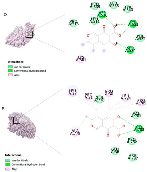 Computational modeling of the interaction of citrinin, a bioactive venom compound of Cassiopea andromeda and Catostylus mosaicus on apoptosis peptides in A549 demonstrating by the three-dimensional plot of the binding sites and the two-dimensional plot of interactions. Interactions of citrinin with (A) caspase-3, (B) caspase-7, (C) caspase-8, (D) caspase-9, (E) Cannabinoid receptor type 1 (CB1), (F) Cannabinoid receptor type 2 (CB2), (G) Death receptor 4 (DR4), (H) Endothelial protein C receptor (EPCR), (I) Fas receptor, (J) insulin-like growth factor 1 receptor (IGF1R), (K) metabotropic glutamate receptors (mGluRs), (L) prostaglandin D2 (PGD2) (M) Peroxisome proliferator-activated receptor gamma (PPAR-γ), (N) Transforming Growth Factor Beta Receptor 2 (TGFBR2), (O) Toll-like receptor 4 (TLR4), (P) Toll-like receptor 9 (TLR9), and (Q) Tumor necrosis factor receptor 1 (TNFR1).