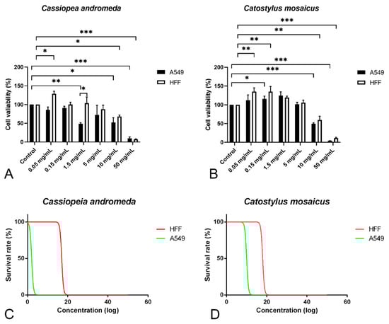 MTT proliferation assay and survival rate of A549 and human foreskin fibroblast (HFF) cell lines after exposure to different concentrations of the venom of Cassiopea andromeda and Catostylus mosaicus. MTT proliferation assay of A549 and HFF cell lines after exposure to Cassiopea andromeda (A) and Catostylus mosaicus (B). Lines above the columns showed differences between treatments and control (* p < 0.05, ** p < 0.01 and *** p < 0.001). Cytotoxic activity of the venom of Cassiopea andromeda (C) and Catostylus mosaicus (D) on A549 and HFF cell lines.