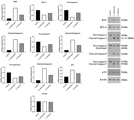 The A549 cell line was treated with a 2 mg/mL concentration of the venom of C. andromeda. The expression of Bcl-2-associated X protein (BAX), Tumor protein P53 (P53), cleaved-caspase-3, -8, and -9 increased in A549 cell line after treatment (Figure 4). However, the expression of B-cell lymphoma 2 (BCL-2), pro-caspase-3, -8, and -9 decreased in A549 cell line after treatment (Figure 4).