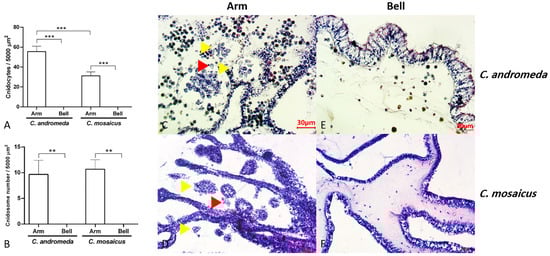 Populations of cnidocytes and cnidosomes in the arms and bells of Cassiopea andromeda and Catostylus mosaicus. (A,B) comparisons of the number of cnidocytes and cnidosomes. Lines show significant differences. ** p < 0.05, *** p < 0.01. C–F: Tissue section of arms and bells to show cnidocytes (red arrow head) and cnidosomes (yellow arrow head). Hematoxylin and eosin (H&E) staining.