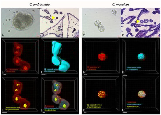 Cnidosomes in the mucus and bells of Cassiopea andromeda and Catostylus mosaicus. (A) An isolated cnidosome from mucus of C. andromeda under stereomicroscope and (B) tissue section of arms to show cnidosomes of C. andromeda (yellow arrow head). H&E staining. (C) An isolated cnidosome from mucus of C. mosaicus under stereomicroscope, (D) Tissue section of arms to show cnidosomes of C. mosaicus (yellow arrow head). H&E staining. Electroluminescence imaging (E–L), light sheet fluorescence microscopy (LSFM) imaging of cnidosomes and 3D reconstruction of them released in the mucus of the C. andromeda and C. mosaicus and their related symbiodiniums in the structure of cnidosomes.