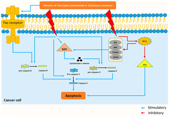The venom of Cassiopea andromeda and Catostylus mosaicus induces the apoptosis pathway in the A549 cell lines. Blue and red lines represent venom-induced stimulus and upregulating reaction, respectively.