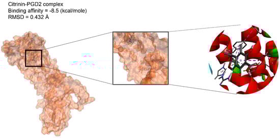 The citrinin, which showed the highest affinity to the targets, was subjected to molecular dynamics. 3D structures of complexes of citrinin with targets obtained through molecular dynamics (MD) are shown in Figure 2. Additionally, RMSDs listed in Table 3 demonstrate the stability of citrinin complexes during 10 runs of molecular dynamic simulation. A lower RMSD value indicates greater stability of the protein complex. As observed, the RMSDs are in the range of 0.432–0.821 Å. It can be seen that the complex of citrinin with PGD2 with a lower RMSD value is more stable compared to other ones. This finding is in accordance with those predicted through the docking simulations.