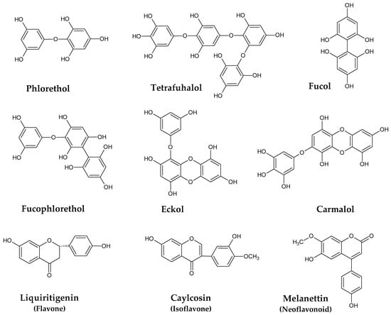 Although less known than phlorotannins, other phenolic constituents in Sargassum species have been described as well (Figure 1). In this regard, the isoflavone caylcosin, the flavone liquiritigenin, and distinct neoflavonoids, including melanettin and stevenin, were identified in S. pallidum [34]. Other isoflavones, such as daidzin, genistein, sissotrin, formononetin, and biochanin A, were reported to occur in S. muticum and S. vulgare [35].