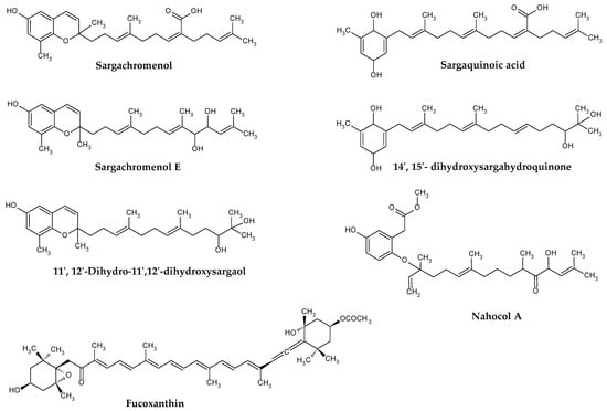 Brown algae, including those from Sargassum genus, also synthesize meroditerpenoids. These compounds have a mixed biosynthetic origin, comprising a polyprenyl chain attached to a p-benzoquinone or hydroquinone moiety [29]. The prefix “mero” stands for “part, partial, or fragment”, in Greek terminology, and thus, “meroditerpenoid” are partially derived from diterpenoids. Common precursors of such compounds in algae are geranylgeranyltoluquinol, γ-tocotrienol, and γ-dehydro-tocotrienol.