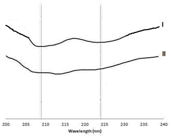 Circular dichroism (CD) spectra of insulin in solution (10 µM) in phosphate-buffered saline (PBS) at pH 7.4 and 25 °C: (I) standard solution (unprocessed), (II) insulin released from nanoparticles.