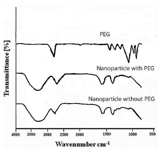 In Table 1, an inverse relationship between the PDI and the PEG concentration was observed in formulations prepared with chitosan and albumin concentrations of at least 0.05% and 1.0%, respectively, where the PDI decreased by increasing the PEG concentration from 0.01 to 0.03% while keeping the concentration of chitosan and albumin solutions constant, as observed in formulations 3 and 4. As nanoparticle dispersions were submitted to dialysis, the escape of PEG from the nanoparticle structure cannot be excluded. The PEG density on nanoparticles is hardly achieved since continuous and complete separation of excess polymers from nanoparticle dispersions may lead to particle aggregation and precipitation [54]. In this experimental work, the presence of PEG in the nanoparticle structure was assessed using FTIR analysis. As shown in Figure 3, nanoparticles prepared with chitosan/PEG exhibit FTIR spectra similar to those of nanoparticles prepared without PEG. Although no evidence for developing new bands or disappearance of characteristic bands considered relevant to PEG was observed, changes in the shift in the absorption bands assigned to PEG located at 962, 1278 and particularly 2885 cm−1 [33] were observed. This indicates the presence of an interaction between chitosan and PEG, which could proceed from the intermolecular hydrogen interactions between chitosan and PEG [55].