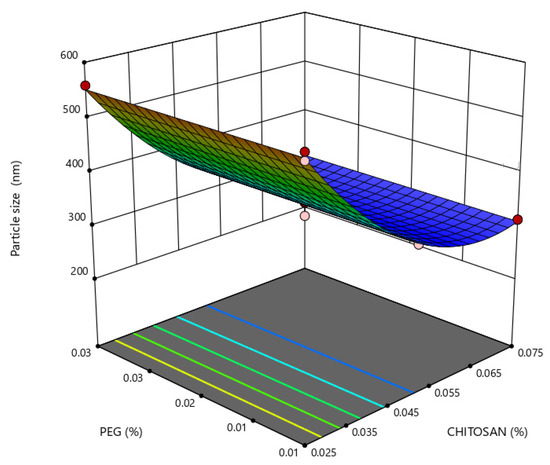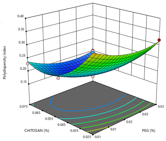 Small particle sizes are most likely to increase intimate contact with the intestinal mucosa, as their higher surface area-to-volume ratio increases nanoparticle uptake in GI mucosa. As seen in Figure 4, a more pronounced effect of chitosan concentration on nanoparticle size is observed for chitosan concentration values lower than 0.05%, whereas, lower PDI values were obtained with a higher concentration of PEG and an intermediate and higher concentration of chitosan, as seen in Figure 5.