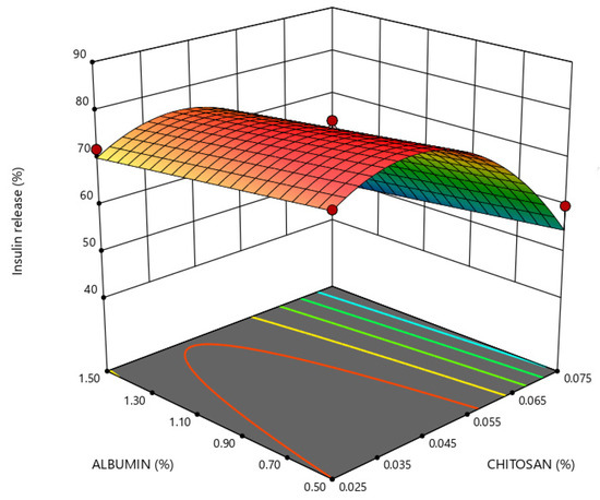 Insulin release in enzyme-free simulated digestive media depended on chitosan and albumin concentrations, as shown in Figure 6 and Figure 7. The protection of insulin against adverse conditions in gastric simulation through its retention within the nanoparticles is obtained by a higher concentration of chitosan and albumin at a constant level of PEG.
