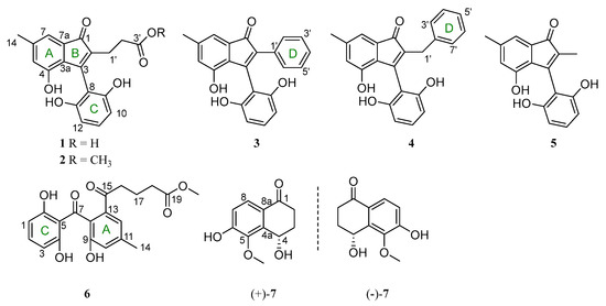 - Liu, Z.M.; Qiu, P.; Li, J.; Chen, G.Y.; Chen, Y.; Liu, H.J.; She, Z.G. Anti-inflammatory polyketides from the mangrove-derived fungus Ascomycota sp. SK2YWS-L. Tetrahedron 2018, 74, 746–751. [Google Scholar] [CrossRef]