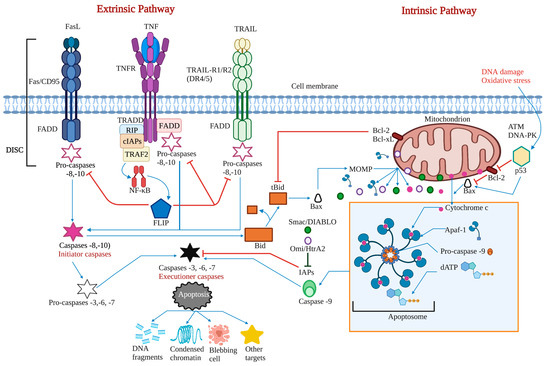 The extrinsic pathway is triggered when the death ligands, including FasL, tumor necrosis factor (TNF), and TNF-related apoptosis-inducing ligand (TRAIL), bind to their corresponding death receptors Fas, tumor necrosis factor receptor (TNFR), and TNF-related apoptosis-inducing ligand receptor 1/2 (TRAIL-R1/2 or death receptor 4/5 (DR4/5). The intracellular death domains of these complexes engage adaptor proteins such as Fas-associated protein with death domain (FADD) and TNFR1-associated death domain protein (TRADD), as well as caspase-8 or -10, forming the death-inducing signaling complex (DISC). This complex activates the apoptosis-initiating caspases -8 and -10, activating executioner caspases-3, -6, and -7 [12]. Caspases are a group of enzymes of the cysteine protease family capable of hydrolyzing tetrapeptides containing an aspartic acid residue. They are synthesized as zymogens (inactive proenzymes or pro-caspases) that are converted into the active form by proteolytic breakage, acquiring their catalytic capacity to degrade their target substrates. The initial activation of a caspase causes a chain reaction that leads to the activation of other caspases and cell death [13].