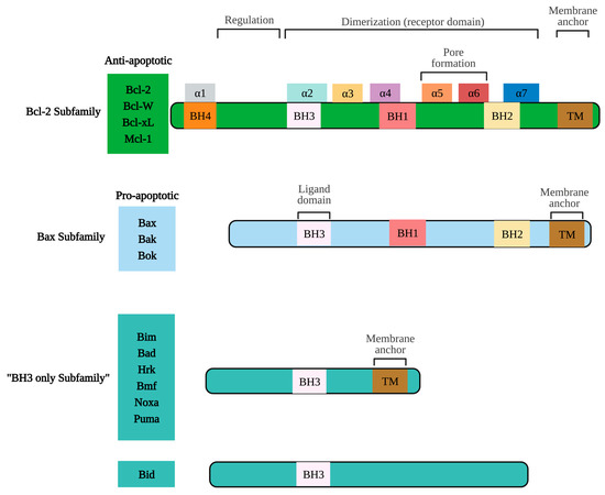 Different BH domains of Bcl-2 subfamilies members. Taken and modified from Jutinico et al. [18]. Bak: Bcl-2-antagonist killer 1; Bax: Bcl-2-associated X protein; Bcl: pro-apoptotic B-cell lymphoma; Bcl-xL: B-cell lymphoma-extra-large Bid: BH3- interacting domain death agonist; Bmf: Bcl-2 modifying factor; Bok: Bcl-2 related ovarian killer.