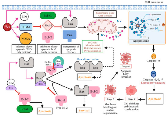 Mechanism of induction and inhibition of pro- and anti-apoptotic proteins by p53 and induction of apoptosis. Taken and modified from Aubrey et al. [20] and Giam et al. [21]. Activation and inhibition of pro-apoptotic and anti-apoptotic proteins, respectively, through the conformational change of Bax, facilitating the permeabilization of the mitochondrial membrane by pore formation, and, consequently, the release of cytochrome c from the mitochondria to the cytosol forming the apoptosome together with cytosolic Apaf-1 and pro-caspase-9, triggering regulated death. Appreciation of the morphological and biochemical changes of apoptosis. Bad: Bcl-2 agonist of cell death; Bak: Bcl-2 antagonist killer 1; Bax: Bcl-2-associated X protein; Bcl-xL: B-cell lymphoma-extra-large; Bcl-2: B-cell lymphoma 2; Bim: Bcl-2 interacting mediator of cell death; Caspase -3, -6, -7, -9: Cysteinyl aspartic acid-protease -3, -6, -7, -9; Mcl-1: Myeloid cell leukemia-1; PUMA: p53 upregulated modulator of apoptosis.