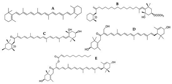 Chemical structure of carotenoids. (A): β-carotene; (B): Fucoxanthin; (C): Fucoxanthinol; (D): Siphonaxanthin; (E): Siphonein.