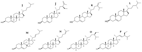 Chemical structure of phytosterols extracted from macroalgae. (I): Cholesterol; (J): Clerosterol; (K): Fucosterol; (L): Campesterol; (M): 22-dehydrocolesterol; (N): Desmosterol; (O): β-sitosterol; (P): Stigmasterol.