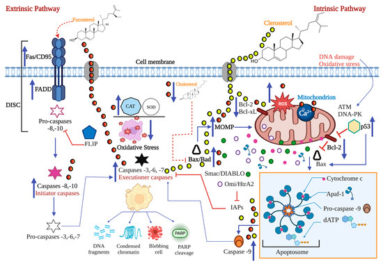 Possible mechanism of action of phytosterols extracted from macroalgae inducing apoptosis. It represents the mechanism of action of some compounds, such as clerosterol and fucosterol, in the extrinsic and intrinsic apoptosis pathway, modulating the target molecules involved. High mitochondrial cholesterol content has been found in different tumors resulting in partial or ineffective oligomerization of Bax that could contribute to apoptotic resistance; due to that, the capacity of phytosterols to decrease cholesterol content is crucial. Violet arrows indicate positive or negative regulation of crucial proteins by such phytosterols. Apaf-1: apoptotic protease activating factor-1; ATM: Ataxia-telangiectasia-mutated; Bax: Bcl-2-associated X protein; Bcl-2: B-cell lymphoma; Bcl-xL: B-cell lymphoma-extra-large; Bid: BH3- interacting domain death agonist; Caspase -3, -6, -7, -8, -9, -10: Cysteinyl aspartic acid-protease -3, -6, -7, -8, -9, -10; CAT: catalase; DNA-PK: DNA-dependent protein kinase; DR 4/5: Death receptor 4/,5; FADD: Fas-associated death domain; FLIP: (FADD-like IL-1β-converting enzyme)-inhibitory protein; HtrA2: High-temperature requirement protein A2; IAP: Inhibitors of Apoptosis Proteins; MOMP: Mitochondrial Outer Membrane Permeabilization; NF-κB: nuclear factor kappa-light-chain-enhancer of activated B cells; PARP: poly (ADP-ribose) polymerase; RIP: Receptor interacting protein; SMAC/DIABLO: Second mitochondrial activator of caspases/direct IAP binding protein with low PI; SOD: superoxide dismutase; tBid: Truncated Bid.