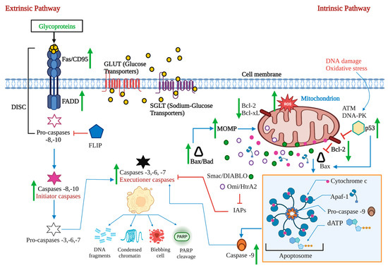 Apoptosis is a regulated cell death process executed by two alternative pathways: extrinsic and intrinsic. However, evading death by different mechanisms is an essential molecular aspect of carcinogenesis. Therefore, inducing apoptosis became one of the essential objectives of cancer therapy. Death receptors, adaptor proteins, FLIP, NF-κB, pro- and anti-apoptotic proteins of the B cell lymphoma (Bcl)-2 family, intracellular ROS and Ca2+ levels, mitochondrial membrane permeability, p53, and initiating and effector caspases are considered the most critical targets of both apoptosis pathways.