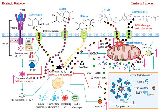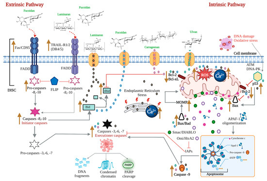 The evasion of regulated cell death by different mechanisms is one of the most important molecular aspects in carcinogenesis because it contributes to cancer progression through tumor proliferation and metastasis. Therefore, inducing apoptosis became one of the most important goals in cancer therapy. Bioactive compounds activating apoptosis through the different signaling pathways can be used as chemotherapeutic agents and/or adjuvants. Therefore, the importance of different compounds is highlighted in Table 1. Carotenoids, phenolic compounds, phytosterols, glycoproteins, polysaccharides, and terpenes, extracted from macroalgae induced apoptosis in different cell lines of mammary adenocarcinoma (MCF-7, MDA-MB-231, and 4T1), prostate adenocarcinoma (DU-145 and PC3), lung adenocarcinoma (A549), carcinoma of the cervix (HeLa), colon carcinoma (ES2, Colo-205, HT-29, LoVo, OV90, and HCT116), gastric carcinoma (AGS), ovarian carcinoma (SKOV3), bladder carcinoma (5637), hepatocarcinoma (BEL-7402, HepG2, LM3, and SMMC-7721), leukemia (HL-60 and SKM-1), melanoma (A2058 and B16F10), and osteosarcoma (OSAS-2). The mechanisms involved include the regulation of death receptors of the extrinsic pathway, of the mitochondrial pathway, of the endoplasmic reticulum pathway, of ROS formation and Ca2+ release, positive and negative regulation of proteins of the Bcl-2 family, activation of initiating and effector caspases, biochemical and morphological changes of the apoptosis mechanism.