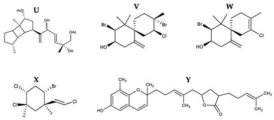 - Wang, B.-G.; Gloer, J.B.; Ji, N.-Y.; Zhao, J.-C. Halogenated Organic Molecules of Rhodomelaceae Origin: Chemistry and Biology. Chem. Rev. 2013, 113, 3632–3685. [Google Scholar] [CrossRef] [PubMed]