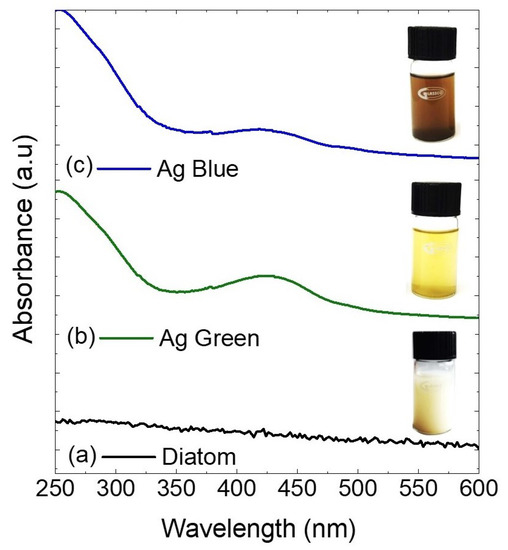 After the photochemical reduction process with 540 nm or 440 nm wavelengths, the sample solutions changed from colorless to purple for the samples irradiated with 440 nm (Ag Blue) and yellow for the sample irradiated at 540 nm (Ag Green). Figure 1 shows the absorption spectra of the silver nanoparticles on diatoms after the photochemical process. In these spectra, the absorption peak in the UV range from 200 nm to 300 nm was due to diatom frustules in both samples [25]. The photoreduction of the silver nanoparticles over the diatoms is evidenced by the surface plasmon resonance (SPR) peak observed at 424 nm from the excitation of free electrons of the spherical-shaped silver nanoparticles [4]. To complement the structural analysis of the diatom, the surface area and pore volume were measured using the Brunauer–Emmett–Teller technique, obtaining 102.30 m2/g and 0.22 cm3/g, respectively. The diatom surface provides a suitable environment for the photochemical reduction of the silver nanoparticles on the diatom surface.