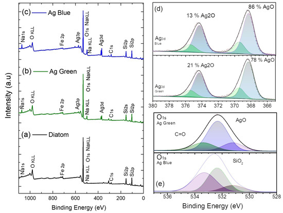 (a) X-ray photoelectron spectrum of diatoms; (a), diatoms irradiated at 540 nm (b) and 440 nm (c). High-resolution scan of (d) Ag3d and (e) O1s.