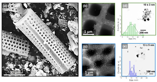 Figure 3a shows the diatomite skeletal structure with a cylindrical and porous frustule with well-defined dimensions and an average of 25 μm in length, 10 μm in diameter, and a pore size of 0.9 ± 0.2 μm. In this figure, the effectiveness of the photoreduction process is revealed by the presence of silver nanoparticles on the surface of the diatoms. In Figure 3b, the nanoparticles irradiated with the 540 excitation wavelength show agglomerations with 10 ± 3 nm. Meanwhile, in Figure 3c, the diatoms irradiated at 440 nm excitation wavelengths show a high concentration of nanoparticles with 13 ± 5 nm and 9 ± 3 nm uniformly distributed over the diatom surface.