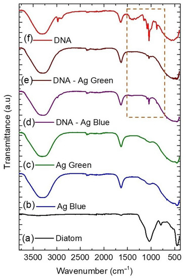 In Figure 4, the most prominent peak of the diatom appears at 1003 cm related to the Si–O–Si stretching, at 791 cm to the Si-OH silanol stretching, and 444 cm to the siloxane bending [26]. These spectra are characteristic of the siliceous structure of the diatom frustule and show that the photoreduction process does not alter the diatom structure. After the photoreduction process, we added a drop of DNA to the nanocomposites and characterized them using FTIR spectroscopy. In Figure 4 and Table 2, we identify the main peaks related to the interaction between the DNA and the nanocomposites through the N-H and C-N bindings at 2974 and 1044 cm [27].