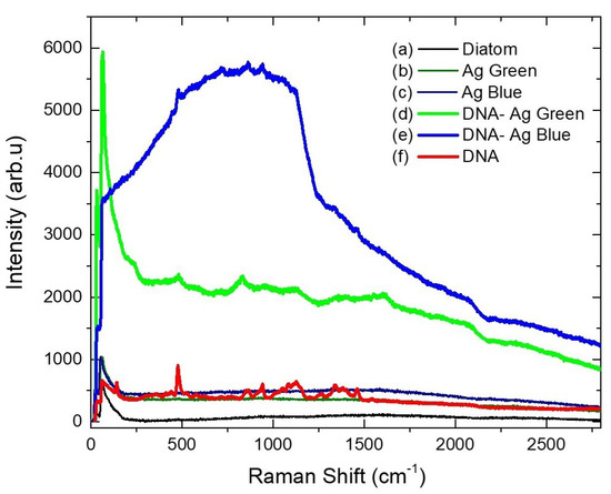 Raman spectra of (a) diatoms, diatoms irradiated at (b) 540 nm (Ag Green), (c) 440 nm (Ag Blue). Diatoms with DNA, irradiated at (d) 540 nm (DNA Ag Green), (e) 440 nm (DNA Ag Blue), and (f) DNA pristine, measured with 633 nm excitation wavelength.