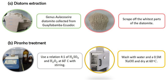 Diatoms were collected from the Guayllabamba inter-mountain basin, Ecuador, from the planktonic species and genus Aulacoseira. Hydrogen peroxide (), sulfuric acid (, and trisodium citrate () were purchased from Loba Chemie. Silver nitrate () and sodium borohydride () were obtained from Sigma-Aldrich. The chemicals were not further modified and were used as received.