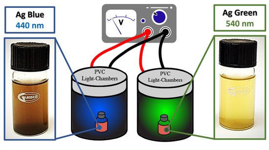 The photoreduction process was performed using irradiation of light at 440 or 540 nm excitation wavelength, respectively (Figure 8), following the design of Saade et al. [35] with further modifications previously reported [36,37] to provide the power of wavelength to the chambers using LEDs of 1 W each. Eight LEDs were placed in a series configuration with a current of 0.7 A and 5 V, inside a PVC tube of 12 cm in height, 11 cm in diameter, and 2 mm in thickness. To decorate the samples, 50 mg of diatoms were dispersed in 50 mL of . Then, 0.9 mL of sodium borohydride was added to the solution. Afterward, and with constant stirring, 75 μL of silver nitrate (0.1%) was injected each 5 min for 1 h. Furthermore, the samples were kept at constant stirring and exposed to the wavelength source inside the chambers for 4 h. The same process was repeated for both irradiation wavelengths (440 or 540 nm).