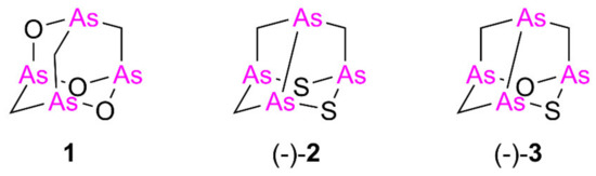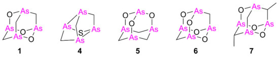 - Marx, M.B.L.; Pritzkow, H.; Keppler, B.K. Struktur von S-9,10-Dimethyl-1,3,5,7-tetraarsa-2,4,6,8-tetraoxaadamantan und 9,10-Diethyl-1,3,5,7-tetraarsa-2,4,6,8-tetraoxaadamantan. Z. Anorg. Allg. Chem. 1996, 622, 1097–1100. [Google Scholar] [CrossRef]