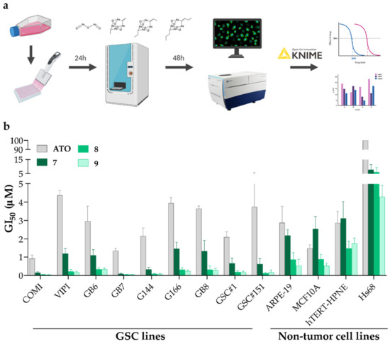 We started by evaluating the potency of the synthesized alkyl polyarsenical analogs 7–9 in inhibiting GSC growth. Indeed, to avoid bias due to GBM inter-tumor heterogeneity, we decided to test the compounds on a panel of nine patient-derived GSC lines, namely COMI, VIPI, GB6, GB7, G144, G166, GB8, GSC#1, and GSC#151. Alongside with GSCs, we also tested these analogs on four non-tumor cell lines to investigate their selectivity. In detail, the non-tumor cell lines tested were MCF10A, from the breast epithelium, ARPE-19, from the retinal pigmented epithelium, Hs68, a fibroblast cell line, and hTERT-HPNE, an immortalized pancreatic ductal cell. The compounds were tested by constructing dose-response curves, and the deriving growth inhibition 50 (GI50) value, i.e., the compound concentration causing the 50% inhibition of the cellular growth, was calculated. For this purpose, the cells were treated with a range of drug concentrations in an automatic manner using an acoustic droplet ejection technology-based liquid dispenser and, then, after 48 h treatment, the viability was assessed by performing a vital cell count based on Hoechst 33342 and propidium iodide (PI) DNA stainings. Indeed, the number of viable cells was calculated by subtracting PI-positive cells from the total number of cells, represented by Hoechst 33342 staining (Figure 3a). Figure 3b and Table 2 show the GI50 values obtained in the different cell lines tested for each of the four compounds under evaluation.