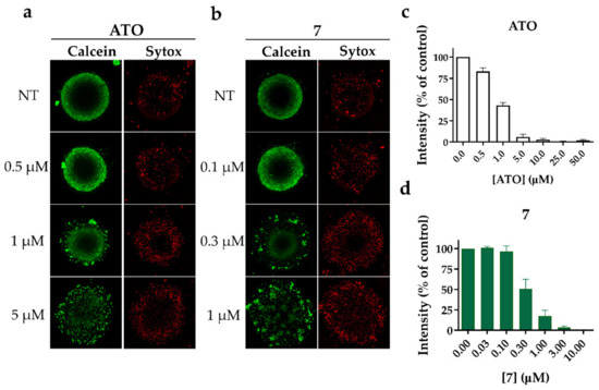 (a,b) Representative images of Calcein AM and SYTOX™ Red Dead Cell Stain staining of COMI gliomaspheres treated for 4 days with different concentrations of (a) ATO or (b) 7. Images were obtained using ImageXpress High Content Imaging System. (c,d) CellTiter-Glo® 3D Cell Viability Assay to measure the viability of gliomaspheres treated with (c) ATO or (d) 7. Data are represented as CellTiter-Glo® 3D intensity normalized on control. n = 3 biological replicates, mean ± SD.